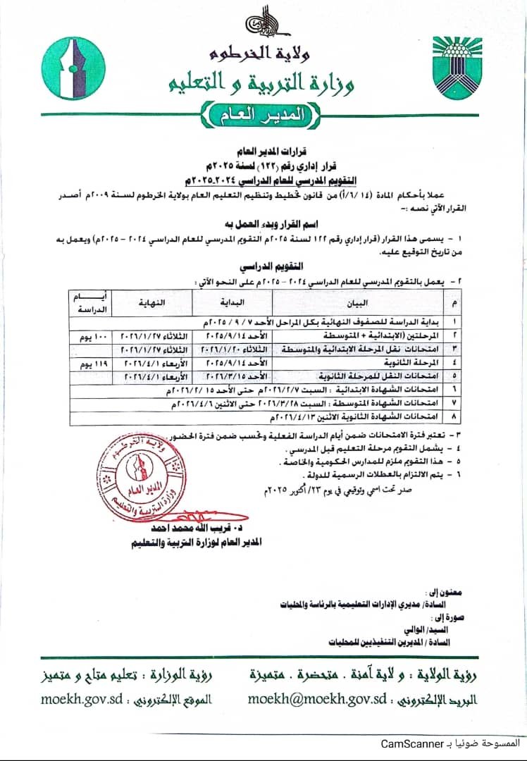الخرطوم –المقرن أصدر المدير العام لوزارة التربية والتعليم بولاية الخرطوم، الدكتور قريب الله محمد أحمد،…