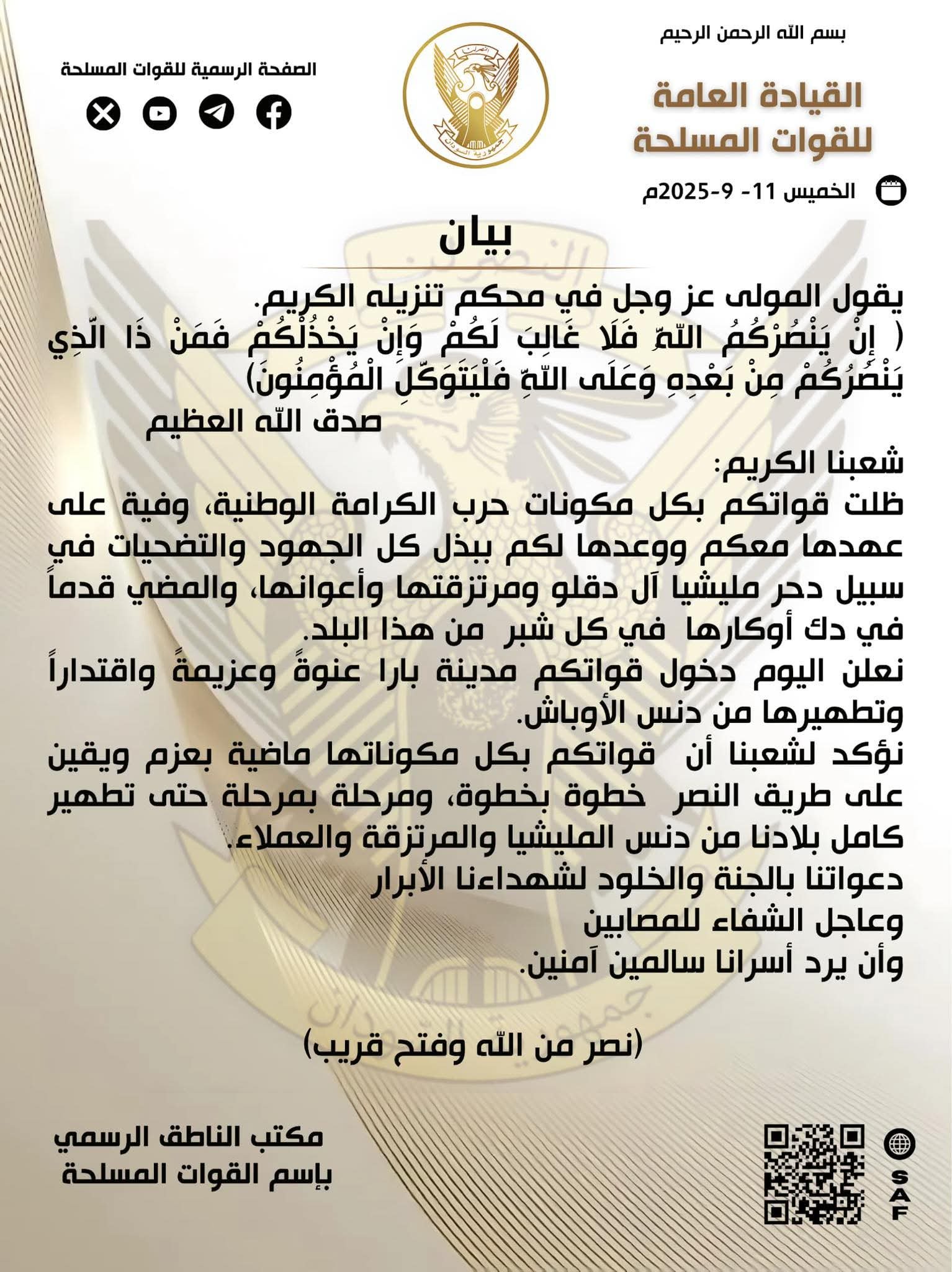 القيادة العامة للقوات المسلحة بيان الخميس ١١ سبتمبر ٢٠٢٥م