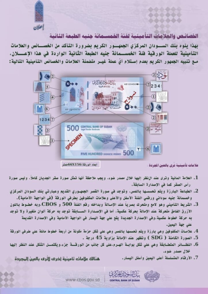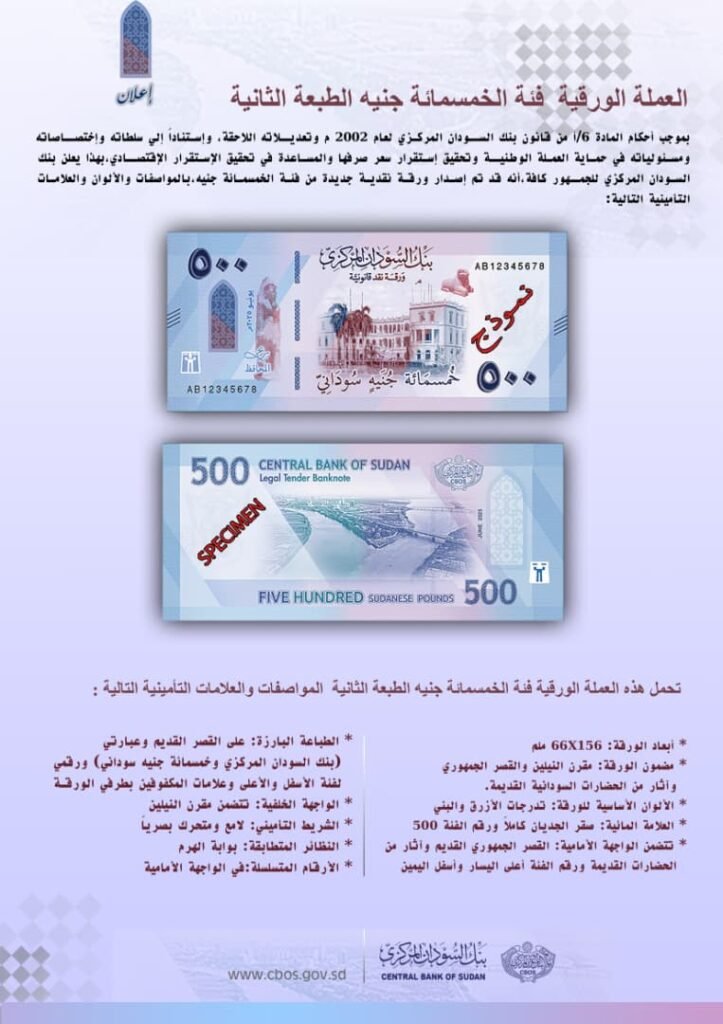أخبار و تقارير الاقتصادية أخبار السودان, السودان, بنك السودان المركزي aboody 13 نوفمبر، 2025 0 تعليقات بنك السودان المركزي.. إصدار عملة ورقية جديدة فئتي 500 جنيه – 2000 جنيه تفاصيل المواصفات الخاصة بالإصدار الجديد من العملة الورقية فئتي 2000 جنيه و 500 جنيه حسب ما ورد من بنك السودان المركزي