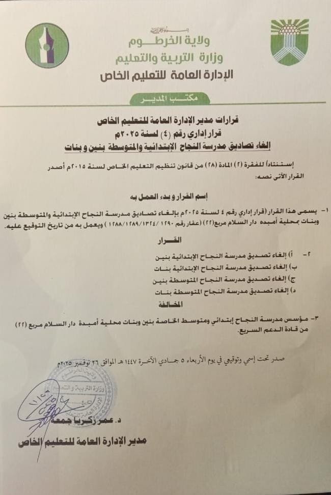 وأصدر مدير الادارة العامة للتعليم الخاص د.عمر زكريا جمعة القرار الإداري رقم 4 لسنة 2025 بإلغاء التصاديق استنادا لقانون تنظيم التعليم الخاص بالولاية لسنة 2015.