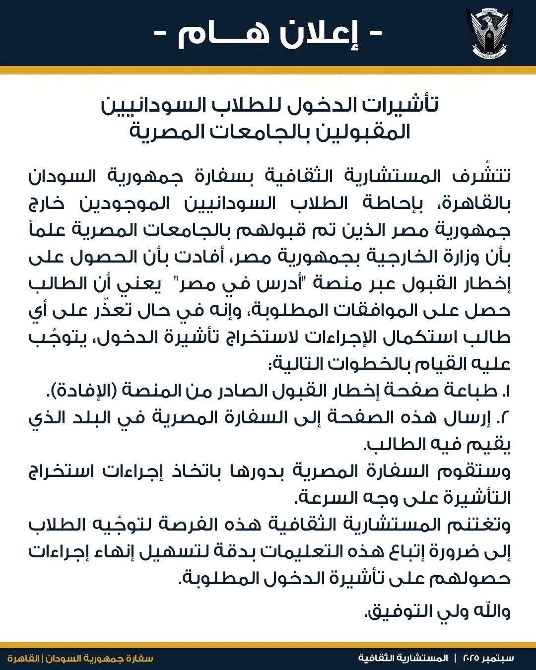 إعلان مهم بشأن تأشيرات الدخول للطلاب السودانيين المقبولين بالجامعات المصرية